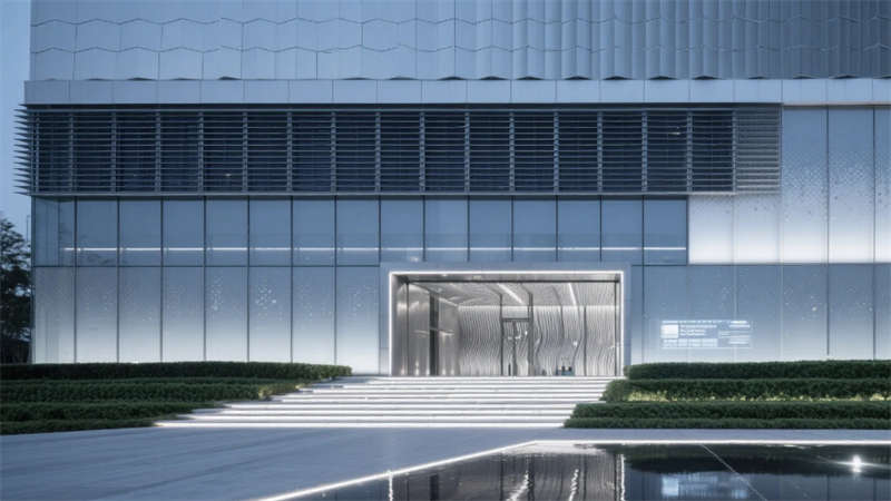 本項目以“未來生態(tài)辦公”為核心理念,在6500㎡空間內(nèi)構(gòu)建六大智能功能模塊,實現(xiàn)科技美學(xué)與可持續(xù)理念的深度融合。建筑外立面采用銀灰色陽極氧化鋁蜂窩板與漸變釉點玻璃幕墻體系,階梯式生態(tài)綠墻與鏡面水景形成碳中和界面,頂部隱形風力發(fā)電模塊與動態(tài)全息標識彰顯企業(yè)科技基因。