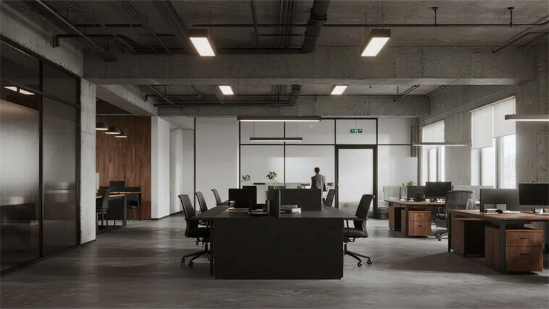 這組工業(yè)風辦公室設(shè)計以裸露結(jié)構(gòu)和復古質(zhì)感為核心,通過混凝土、金屬和木質(zhì)材料的碰撞,打造出兼具實用性與藝術(shù)感的辦公空間??臻g保留了建筑的原始肌理,如天花板的管線和墻面的磚紋,搭配黑色鐵藝家具和深色調(diào)軟裝,營造出冷峻而富有張力的氛圍。局部通過皮質(zhì)沙發(fā)、綠植和暖光燈具軟化工業(yè)風的硬朗感,增添人文氣息。