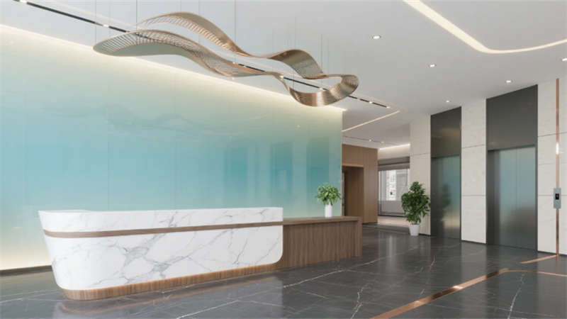 本項(xiàng)目以“科技賦能人文”為核心,立足現(xiàn)代簡約美學(xué),打造6000平方米的智慧化辦公空間。建筑外觀采用玻璃幕墻與金屬線條交織,底部淺灰石材與垂直綠植形成生態(tài)過渡,10米挑高雨棚嵌入企業(yè)LOGO燈箱,塑造科技企業(yè)的先鋒形象。