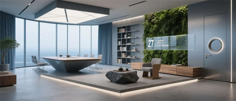本項目以“未來生態(tài)辦公”為核心理念,打造1200㎡科技與自然交融的創(chuàng)新型辦公空間。設(shè)計采用啞光太空灰為主基調(diào),通過霧霾藍(lán)企業(yè)色與原木紋理的碰撞,在冷峻科技感中注入人文溫度??臻g以微水泥地面為基底,貫穿透光亞克力與陽極氧化鋁材質(zhì),配合隱藏式線性燈帶的流動光影,構(gòu)建出具有呼吸感的數(shù)字美學(xué)場域。
