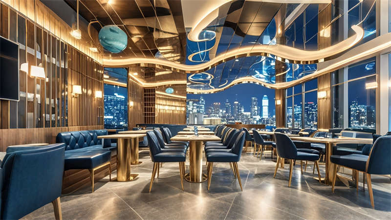 色彩體系以香檳金與深海藍(lán)為主調(diào),大堂采用香檳金金屬線條勾勒建筑肌理,搭配深海藍(lán)大理石營造視覺重心。客房區(qū)運用暖灰硬包墻面平衡色彩強(qiáng)度,通過2700K暖光與4000K中性光分區(qū)照明塑造晝夜場景。材質(zhì)組合注重層次:大理石地面、金屬構(gòu)件、絨布軟包形成質(zhì)感三部曲。