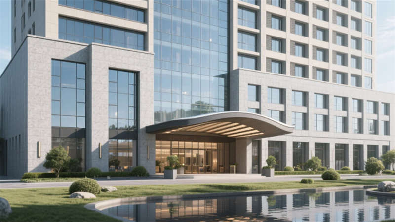 酒店外立面以玻璃幕墻與淺灰色石材構建極簡輪廓,日間光影在幾何切割面上流動,夜晚則通過暖金色燈帶勾勒出建筑層次,水池倒影與星空交織,詮釋低調奢華的都市意象。
