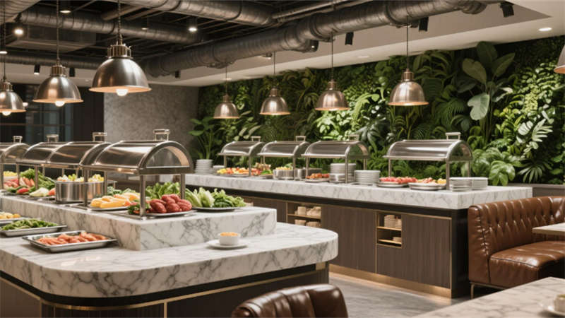 餐廳以工業(yè)風吊燈與綠植墻碰撞出活力氛圍,開放式取餐臺與大理石餐桌彰顯品質;行政套房客廳通過L型布藝沙發(fā)、木格柵電視墻與山景落地窗,打造出私享化的社交場景。